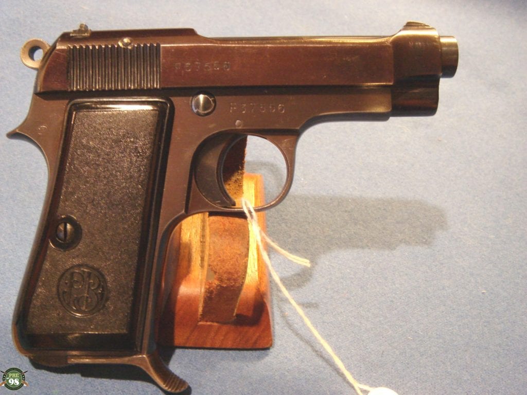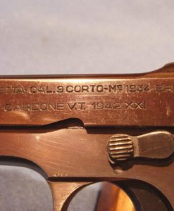 IN 97% EXCELLENT ORIGINAL CONDITION, WE HAVE A NICE EXAMPLE OF THE 1934 BERETTA PIOSTOL IN .380 CALIBER. THIS ONE WAS MADE IN 1942 AND HAS THE STANDARD CROWN/RE ITALIAN ARMY ACCEPTANCE MARK. THIS IS ONE OF THE BEST LOVED OF THE WW2 PISTOLS, DUE TO ITS SMALL SIZE AND .380 CHAMBERING. THEY ARE EXTREMELY WELL MADE AND FINISHED. THIS EXAMPLE IS ALL MATHCING WITH AN EXCELLENT BORE. THE SLIDE IS NOT SO PLUMMY AS YOU USUALLY SEE, MAKING FOR A VERY ATTRACTIVE PIECE. IF YOU ARE LOOKING FOR A NICE EXAMPLE FOR YOUR COLLECTION, LOOK NO FURTHER.