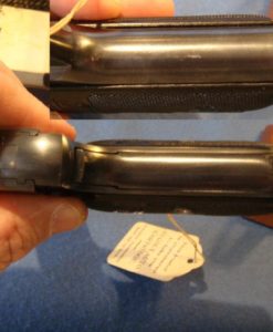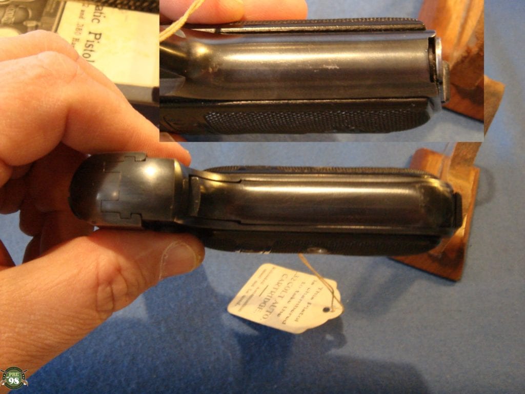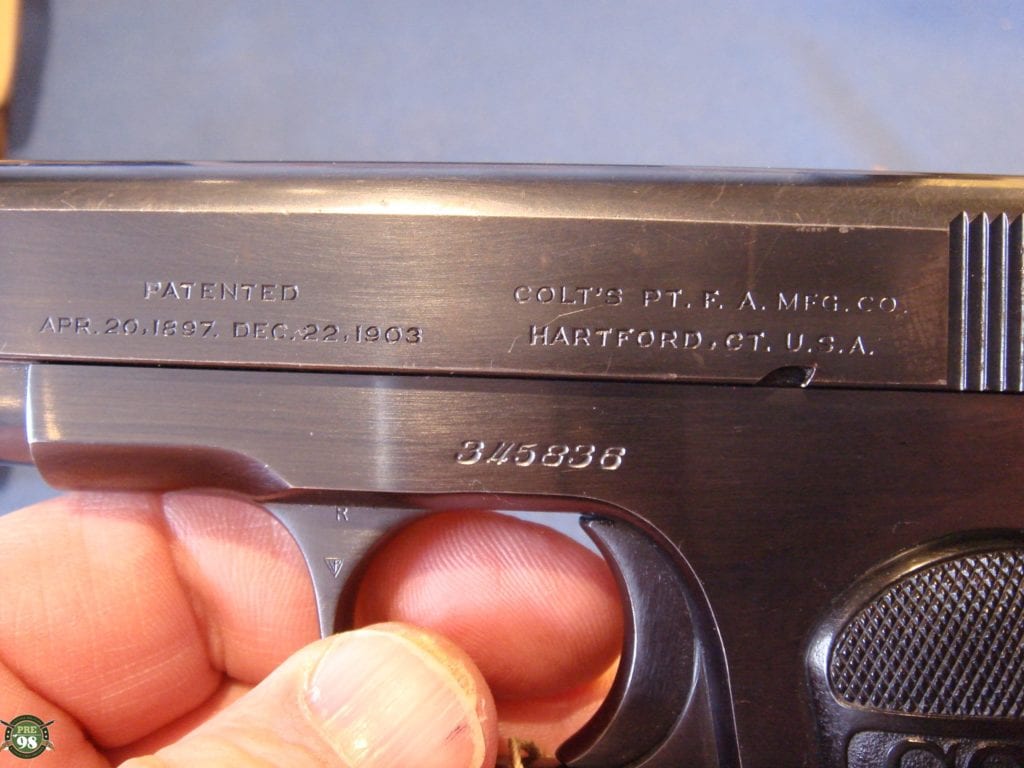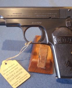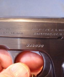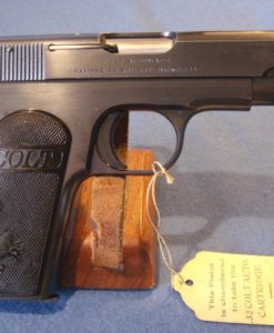 IN 98% ORIGINAL CONDITION, WE HAVE ONE OF MY FAVORITE PISTOLS A VERY CRISP COLT MODEL 1903 POCKET HAMMERLESS .32 AUTO IN THE ORIGINAL BOX WITH THE PAPERS AND THE BRUSH. THIS PISTOL WAS MANUFACTURED IN 1920 WHEN COLT WAS ARMING EVERYBODY IN THE ROARING 20’S. THIS PISTOL IS VERY NICE WITH A MINT BORE, REALLY NICE GRIPS AND JUST SOME HIGH EDGE WEAR FROM THE BOX. THIS IS AN IMPORTANT PISTOL FOR COLT COLLECTORS BECASUE IT IS ONE OF THE EARLIEST EXAMPLES WITH WOOD GRIPS, AND ONE OF THE LAST PISTOLS WITH THE ROUNDED REAR SIGHT. COLT POCKET AUTOS HAVE BEEN ON A REAL TEAR FOR YEARS AND ARE HIGHLY SOUGHT AFTER, THEY DO NOT HANG AROUND FOR VERY LONG WHEN WE GET THEM. ONE OF THE REASONS FOR THIS IS THAT THEY ARE POPULAR ACCROSS A BROAD SPECTRUM, YOU CAN BE A COLT COLLECTOR, A GANGSTER FAN, A MOVIE BUFF, EVEN A JAPANESE MILTARY COLLECTOR AND WANT ONE OF THESE PISTOLS. THIS PISTOL IS THE EPITOMY OF GENTLEMANLY GOOD TASTE AND SOPHISTICATION. THESE ARE REALLY HOT BECAUSE OF ALL THE RENEWED INTEREST DUE TO THE NEW HBO SERIES BOARDWALK EMPIRE WHERE THEY SEE ALOT OF ACTION.