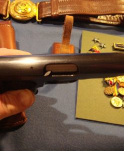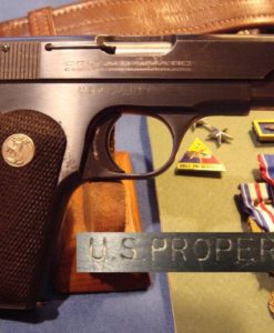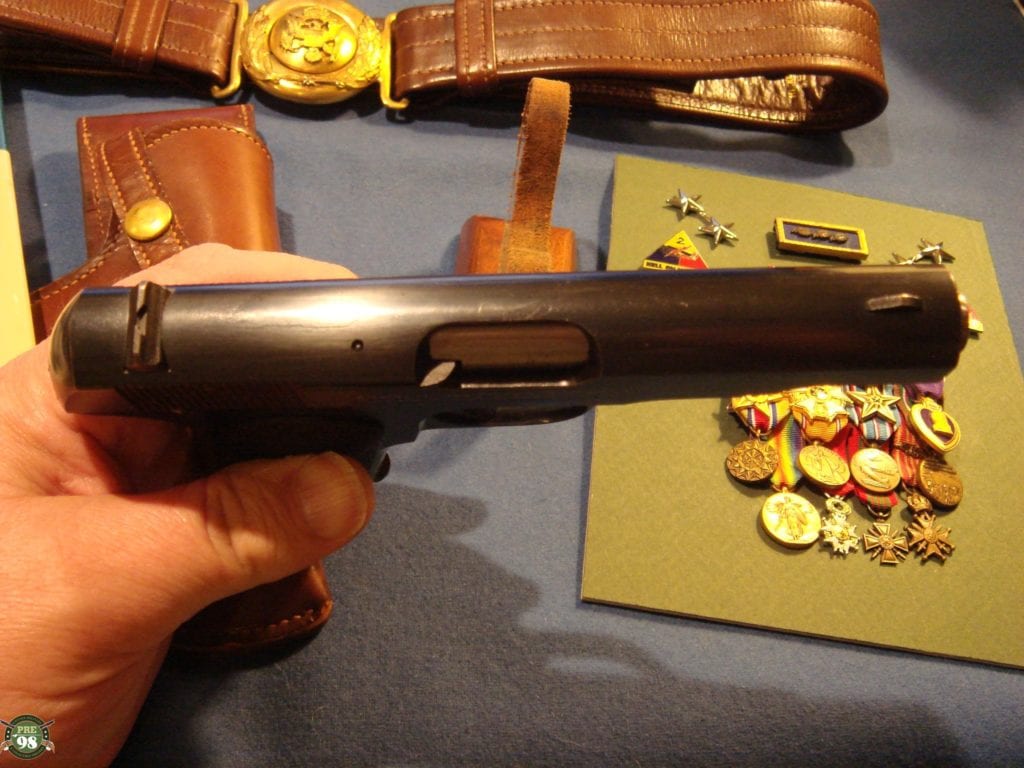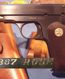 IN 98% CONDTION WE HAVE THE COLT 1908 GENERAL OFFICERS PISTOL THAT WAS ISSUED TO MAJOR GENERAL MAURICE ROSE, WHO COMMANDED THE 3RD ARMORED DIVISION AT THE TIME OF HIS DEATH IN COMBAT ON 30 MARCH, 1945. GENERAL ROSE WAS THE HIGHEST RANKING JEWISH AMERICAN OFFICER DURING WW2 AND WAS THE ONLY GENERAL IN THE EUROPEAN THEATRE OF OPERATION TO BE KILLED IN ACTION WITH THE ENEMY. HAD HE NOT DIED IN COMBAT GENERAL ROSE WOULD HAVE CERTAINLY BEEN A HOUSEHOLD NAME TODAY AS HE WAS ONE OF THE MOST AGRESSIVE AND HIGHLY DECORATED COMMANDERS OF WW2. THIS PISTOL COMES WITH THE ORIGINAL GEN OFFICERS BELT AND HOLSTER AND AN EXTENSIVE AMOUNT OF RESEARCH INCLUDING MANY FIRST HAND ACCOUNTS OF THE GENERAL AND THE CIRCUMSTANCES OF HIS DEATH. THERE ARE GENERAL OFFICERS PISTOLS THEN THERE ARE EXCEPTIONAL EXAMPLES THAT ARE PERSONALITY PIECES AND THIS IS CERTAINLY ONE OF THOSE ITEMS. GENERAL ROSE WAS ONE OF THE GREATEST ARMORED COMMANDERS OF WW2 AND THIS PISTOL IS IN NEED OF ANOTHER CARETAKER.