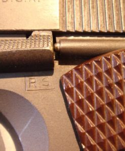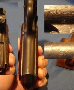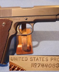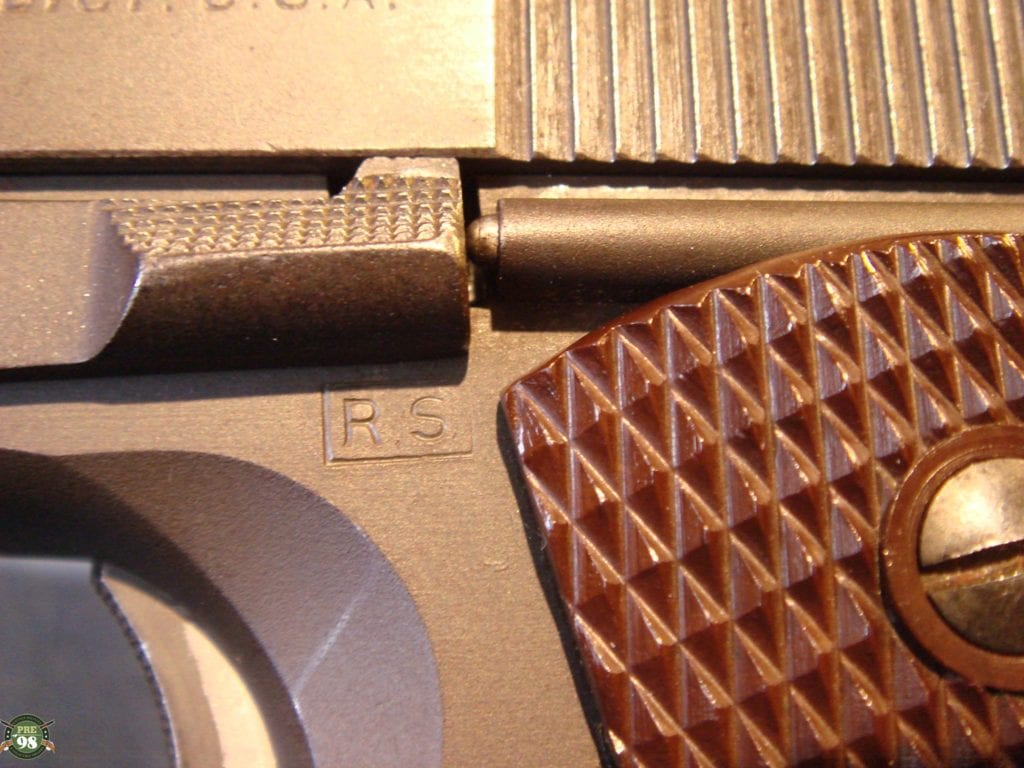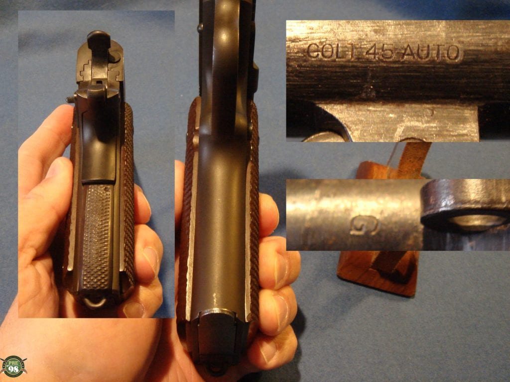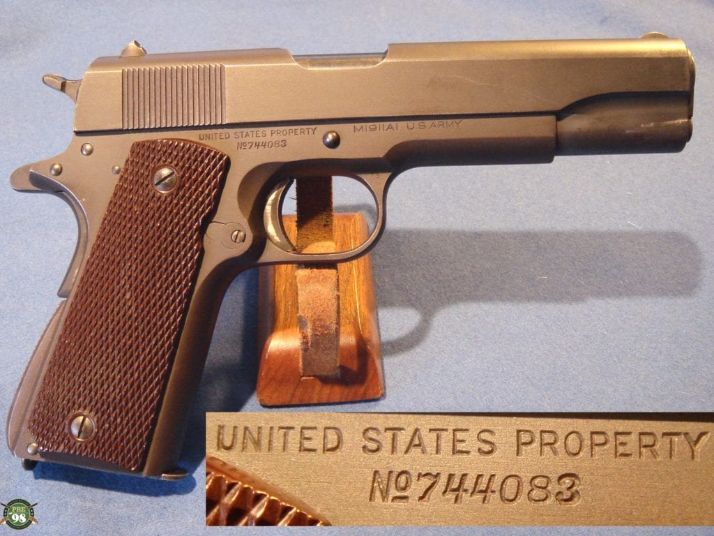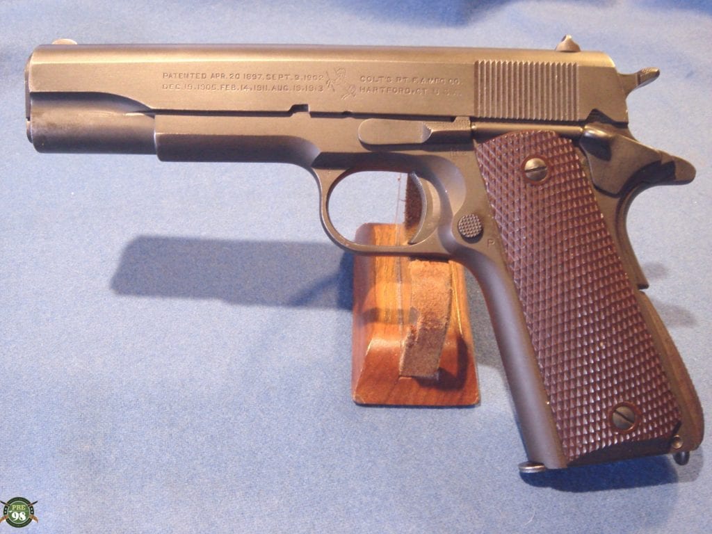 IN 97% ORIGINAL CONDITION WE HAVE A VERY DEISRABLE PRE WAR PRODUCTION COLT 1911A1 PISTOL. THE PISTOL IS MATCHING AND 100% CORRECT AS PER CLAWSON AND INCLUDES THE CORRECT LARGE G MARKED COLT BARREL AND THE VERY RARE COLTWOOD HOLLOWBACK GRIPS. THESE GRIPS ARE IMPOSSIBLE TO FIND THESE DAYS. THIS PISTOL IS VERY SIGNIFICANT TO COLT COLLECTORS BECAUSE IT IS ONE OF THE EARLIST GUNS TO BE FINISHED IN THE NEW PARKERIZED FINISH, WHICH WAS MUCH MORE DURABLE THAN BLUE. ROBERT SEARS PROOF COLTS ARE HARD TO FIND ESPECIALLY IN THIS MINT ORIGINAL CONDITION. THIS IS A SERIOUS COLLECTORS PIECE.