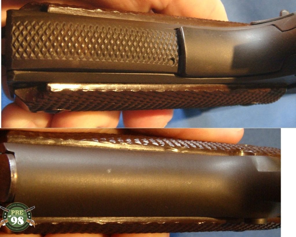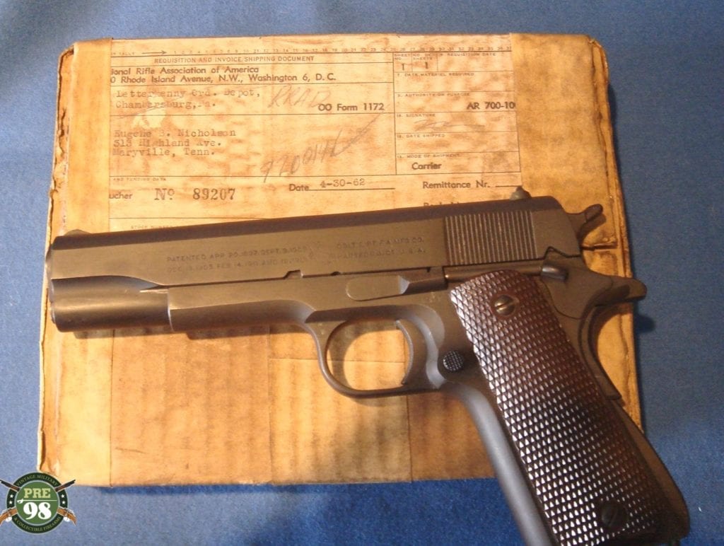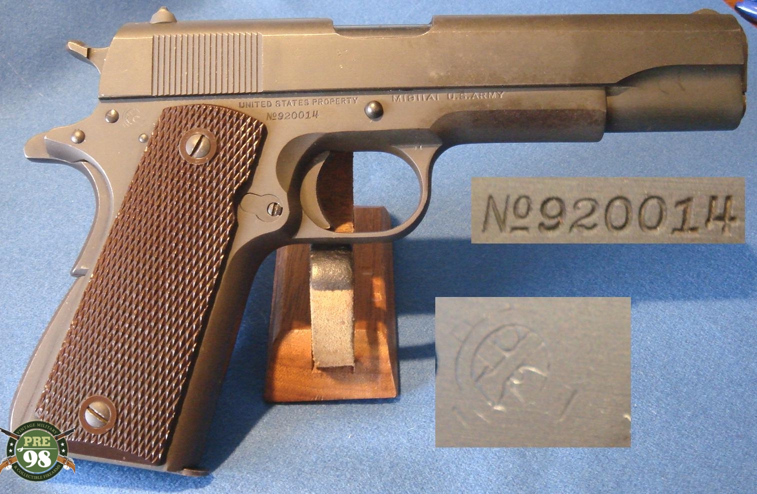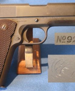IN AT LEAST 95% ORIGINAL CONDITION, WITH THE ORIGINAL NRA 1962 SHIPPING BOX NUMBERED TO THE GUN, WE HAVE A NICE EXMAPLE OF A COLT 1911A1 ARMY .45 AUTO. THE PISTOL IS APRIL 1943 PRODUCTION WITH THE MATCHING NUMBERED SLIDE. 100% CORRECT AS PER CLAWSON. BORE IS EXCELLENT AND THE GRIP STRAPS ARE SUPER NICE. ONLY REAL WEAR IS SOME VERY SLIGHT WET HOSLTER STAINING OR THE GUN WOULD GRADE OUT AT 98%. LOOKS LIKE THE GUN WAS CARRIED BUT NOT HARDLY USED. THIS IS A VERY CLEAN EXMAPLE OF THE US WW2 SERVICE PISTOL IN NICE COLLECTABLE CONDITION. THE GUN IS JUICED UP QUITE A BIT BY HAVING THE ORIGINAL SHIPPING BOX, THAT IS A BIG PLUS AND YOU DO NOT SEE THAT VERY OFTEN THESE DAYS.
