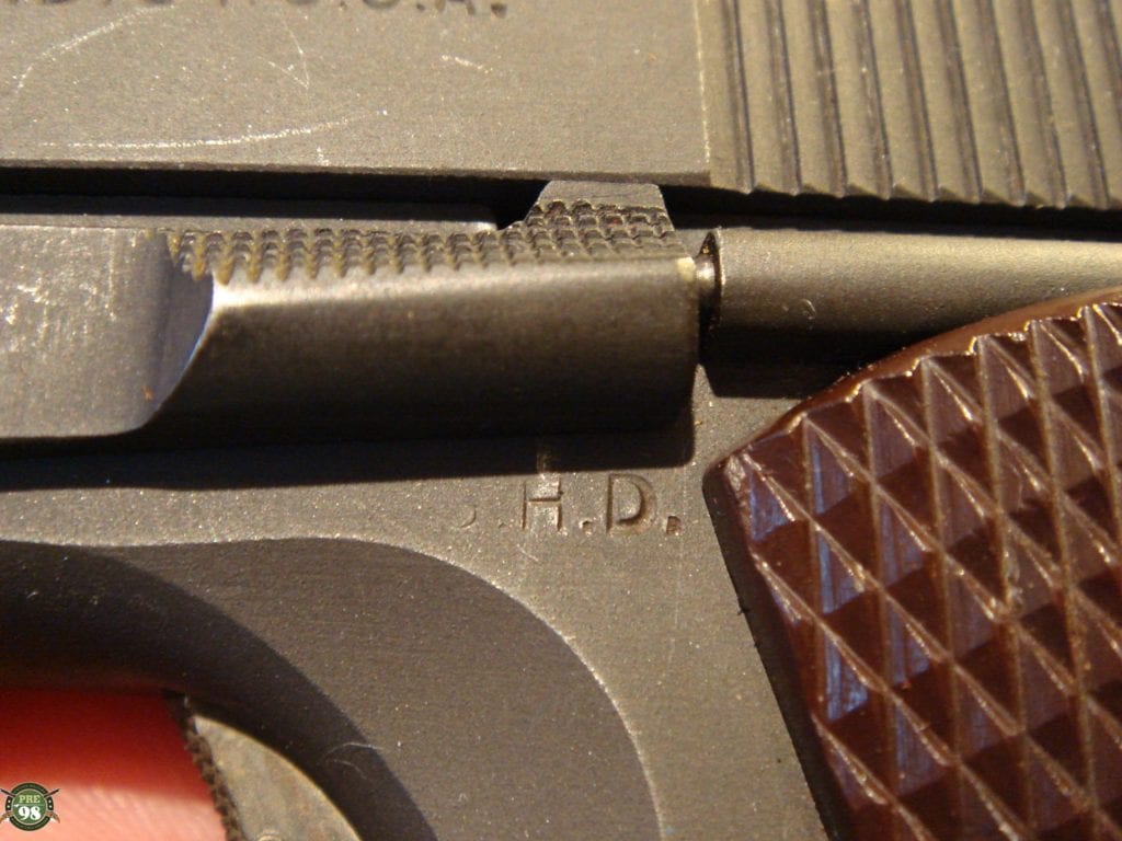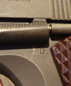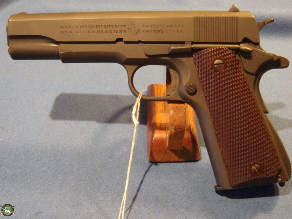 IN 99% ORIGINAL CONDITION, 100% CORRECT AS IT LEFT THE FACTORY WE HAVE A NICE VET BROUGHT BACK COLT 1911A1. THIS PISTOL WAS SHIPPED FROM COLT’S TO SPRINGIELD ARMORY IN EARLY MARCH OF 1943. THIS IS AN EARLY GHD INPECTED PISTOL WITH THE SMALL GHD MARKNG. GUN IS ALL CORRECT WITH THE PROPER COLT P PROOFED BARREL AND THE LARGE RING GRIPS. THE BORE IS MINT IN FACT THE BARREL IS REALLY NICE, THIS GUN SHOWS HARDLY ANY WEAR. THIS IS THE CRISPEST COLT THAT WE HAVE HAD IN A WHILE ITS PRACTCALLY BRAND NEW. WW2 1911A1 COLTS ARE RED HOT AGAIN AND EVERYONE THAT WE HAVE TOUCHED HAS SOLD FAST.