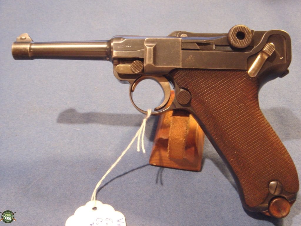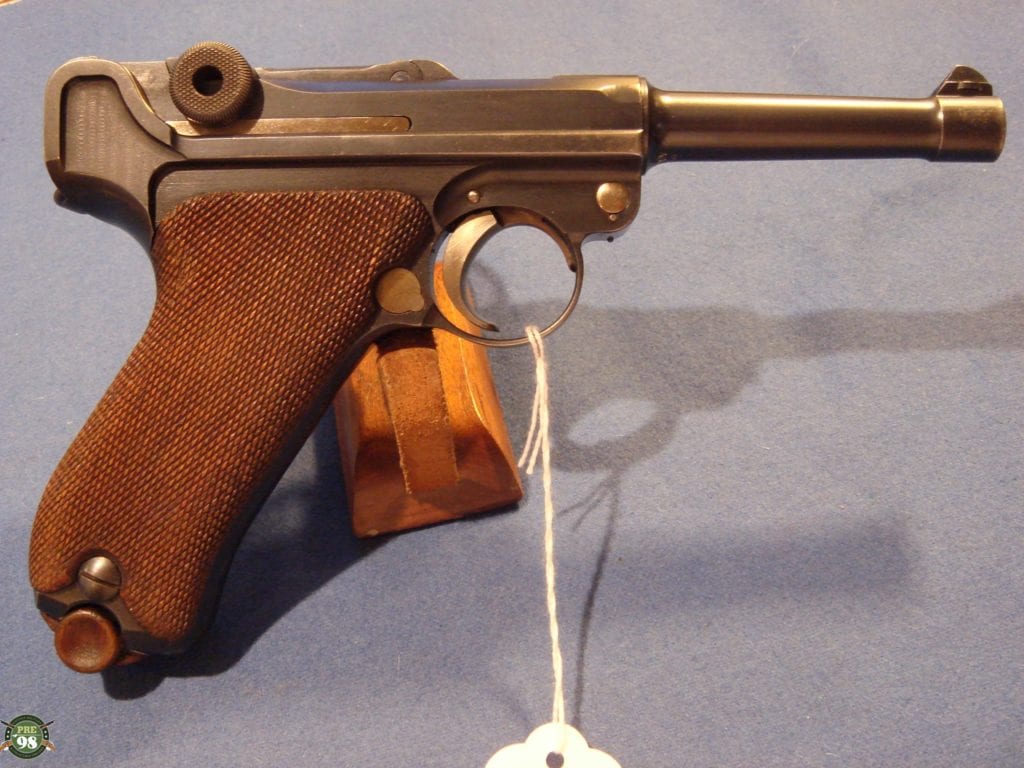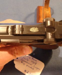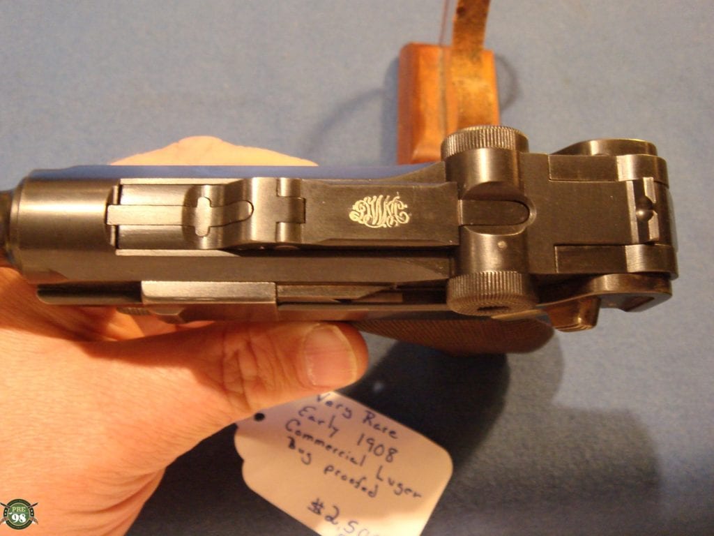 IN 97% ORIGINAL CONDITION, WE HAVE A VERY NICE EXAMPLE OF A EARLY BUG PROOFED 1908 COMMERICAL LUGER IN 9MM. THE GUN IS ALL MATCHING . THE BORE IS EXCELLENT AND THERE IS NO HOLD OPEN INSTALLED. THE MAG IS THE CORRECT UN-NUMBERED MAG AND THE GUN IS NUMBERED IN THE COMMERCIAL STYLE. MANY OF THESE PISTOLS WERE PRIVATELY PURCHASED BY SENIOR OFFICERS OF THE GERMAN ARMY PRIOR TO WW1. IT WAS THE CUSTOM OF THE DAY FOR OFFICERS TO PURCHASE THEIR OWN SIDE ARMS AND THIS WAS THE PISTOL THEY ALL WANTED. AS YOU WELL KNOW ANY 1908 COMMERICIAL IN THIS TOP SHAPE IS HIGHLY SOUGHT AFTER AND IS A GREAT INVESTMENT GRADE PIECE.