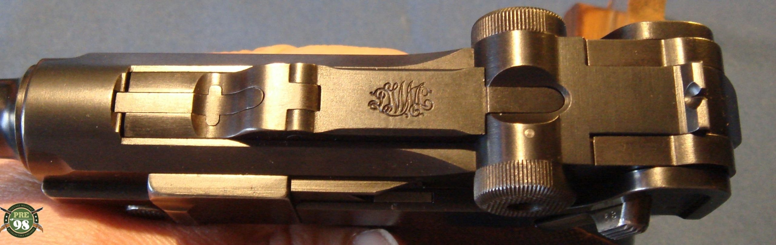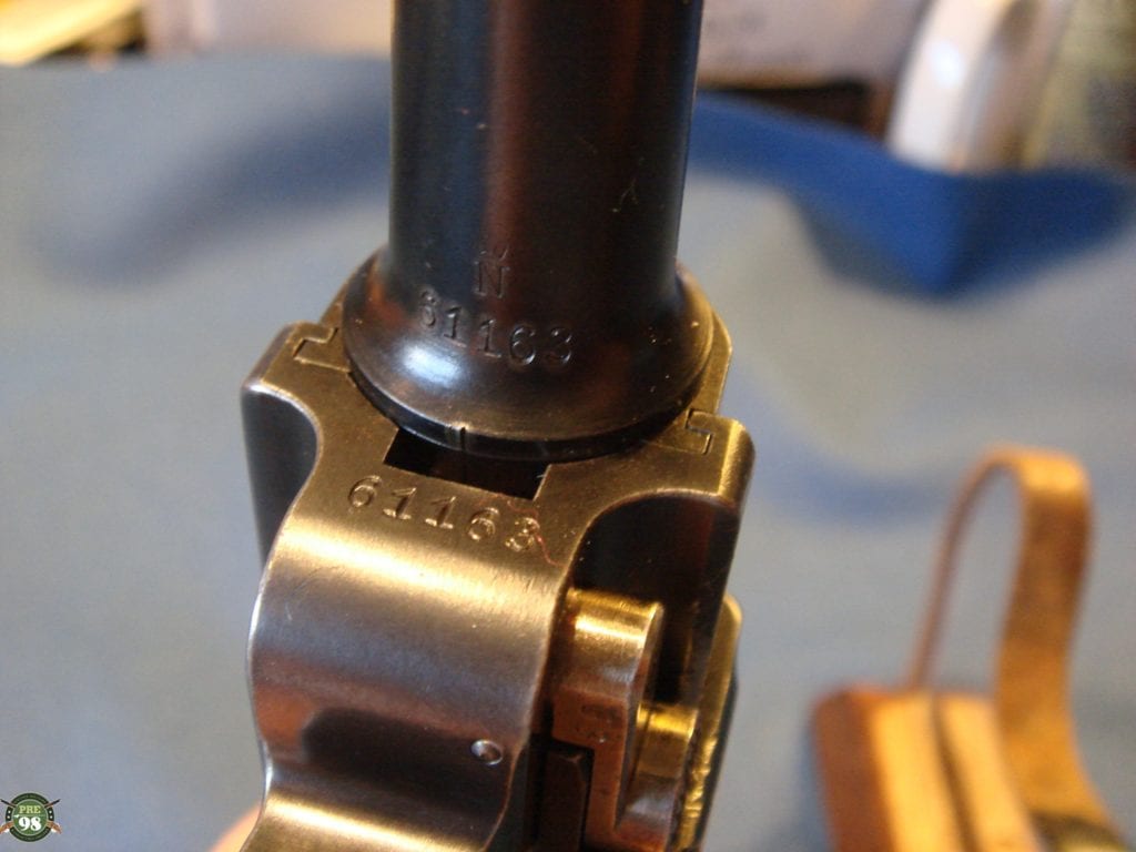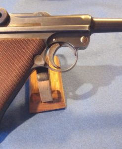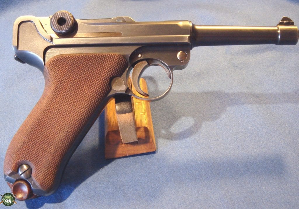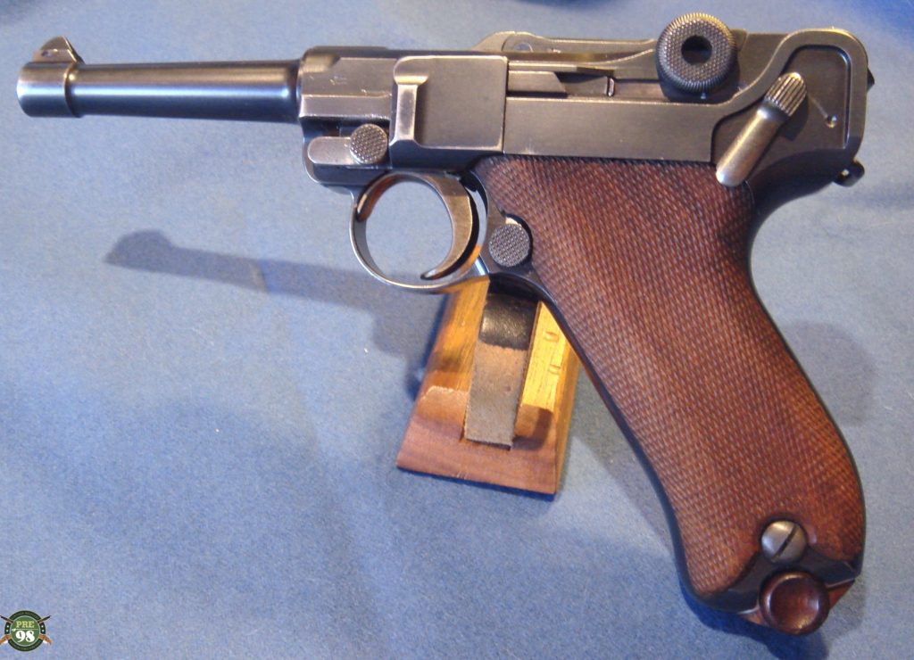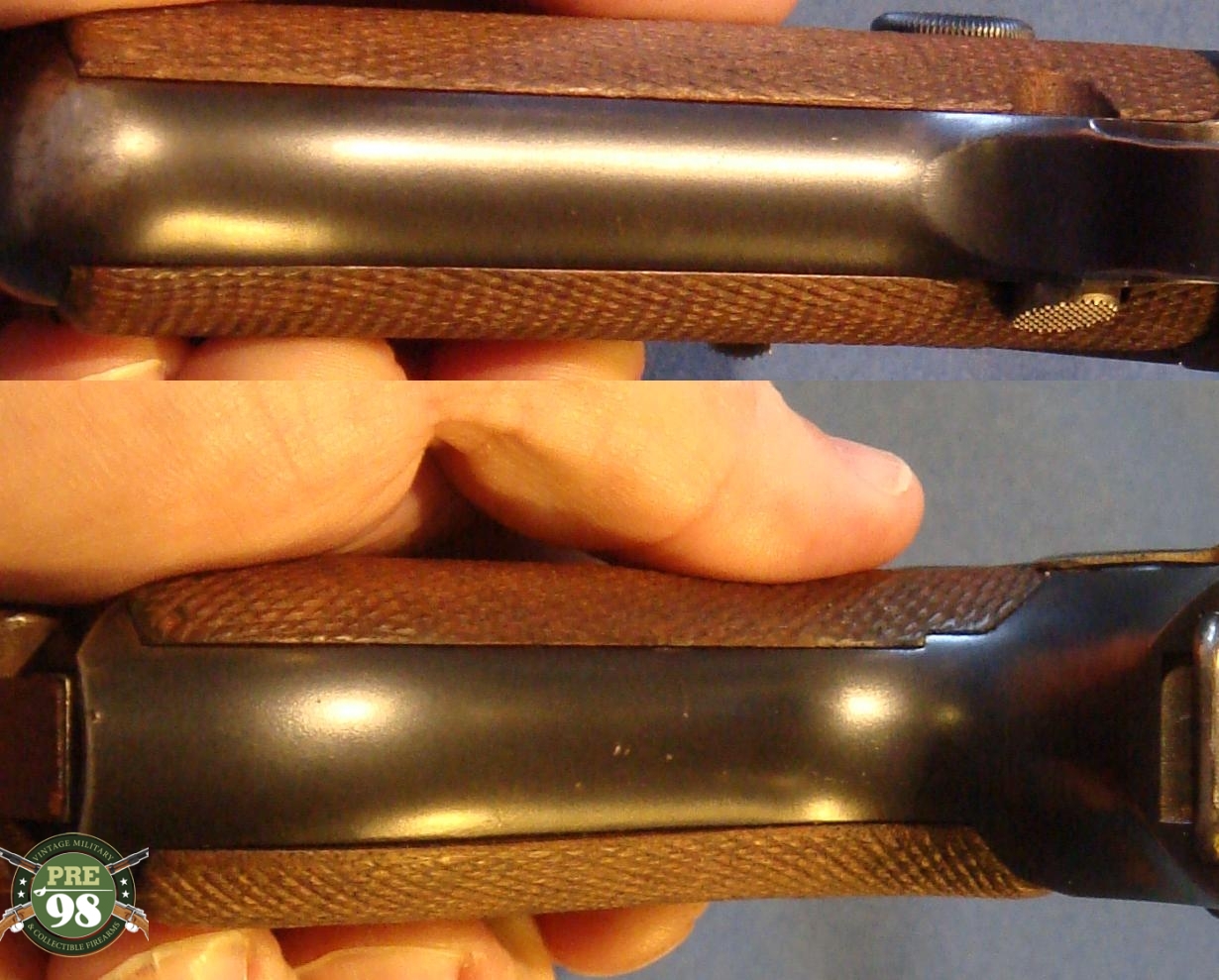 IN 98% ORIGINAL CONDITION, WE HAVE A VERY NICE EXMAPLE OF A 1910-1912 PRODUCTION 1908 COMMERICAL LUGER IN 9MM. THE GUN IS ALL MATCHING WITH A MINT BORE AND THE CORRECT ORGINAL UN-NUMBERED MAGAZINE. THE GUN IS CROWN N PROOFED AND HAS THE HOLD OPEN FEATURE WHICH IS CORRECT FOR PISTOLS IN THIS TIME FRAME. MOST OF THESE GUNS WERE PROBABLY SOLD TO OFFICERS WHO OFTEN PURCHASED THEIR OWN SIDEARMS. AS YOU WELL KNOW ANY 1908 COMMERICIAL IN THIS TOP SHAPE IS HIGHLY SOUGHT AFTER AND IS A GREAT INVESTMENT GRADE PIECE. THIS IS AN EXCEPTIONALLY ATTRACTIVE LUGER, THEY HAVE A RATHER MORE BALANCED LOOK WITH NO STOCK LUG.