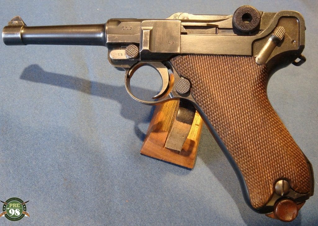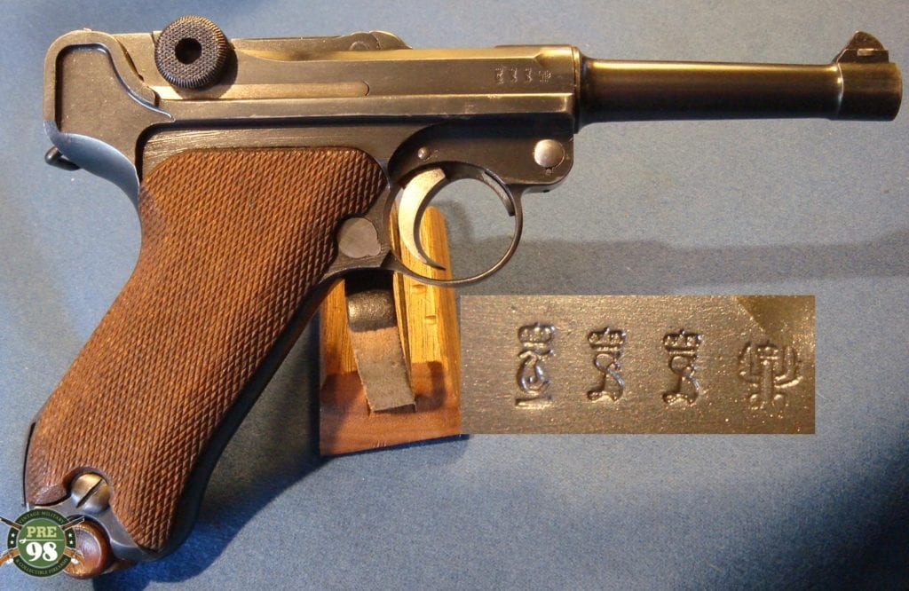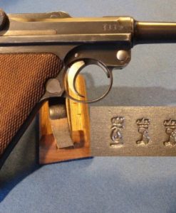 IN 98% ORIGINAL CONDITION, STILL WITH THE ORIGINAL MATCHING MAG, WE HAVE A VERY NICE EXAMPLE OF A 1918 DATED DWM LUGER. BORE IS EXCELLENT AND THIS IS A REALLY SHARP LOOKING LUGER. THIS WAS THE LAST YEAR OF DWM MILITARY PRODUCTION AND IT ENDED IN NOVEMBER 1918. 1918 LUGERS ARE NOTED TO BE ROUGHLY MADE, HOWEVER THIS IS AN EARLY 1918 GUN AND THE FIT AND FINISH ARE MORE IN KEEPING WITH WHAT YOU WOULD SEE ON A NICE 1917 GUN. THIS IS A PARTICULARLY NICE EXAMPLE AND IF YOU ARE COLLECTING WW1 LUGERS THIS IS A VERY NICE FIND.