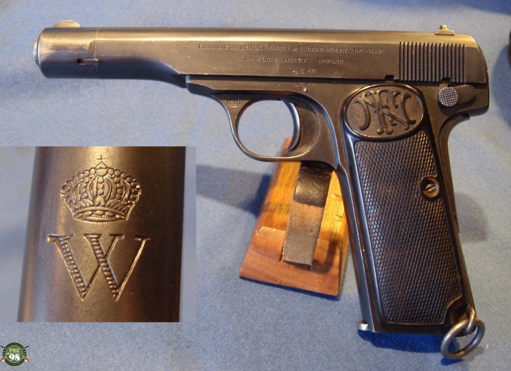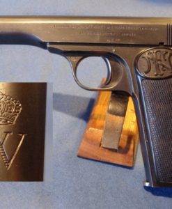 IN 96% EXCELLENT ORIGINAL CONDITION, WE HAVE A NICE EXAMLE OF THE VERY WELL KNOWN DUTCH CONTRACT FN 1922 WITH THE CREST OF WILHELMINA. THE PISTOL IS IN .380 AND IS ALL MATHCING WITH AN EXCELLENT BORE. THIS PISTOL IS WITH A DUTCH ARMY ISSUED HOLSTER AND CLEANING ROD. THIS IS A TOUGH RIG TO FIND COMPLETE. ALMOST CERTAINLY THIS PISTOL WAS CAPTURED AND RE-ISSUED BY THE GERMANS. MANY OF THESE PISTOLS ENDED UP WITH THE KREIGMARINE.