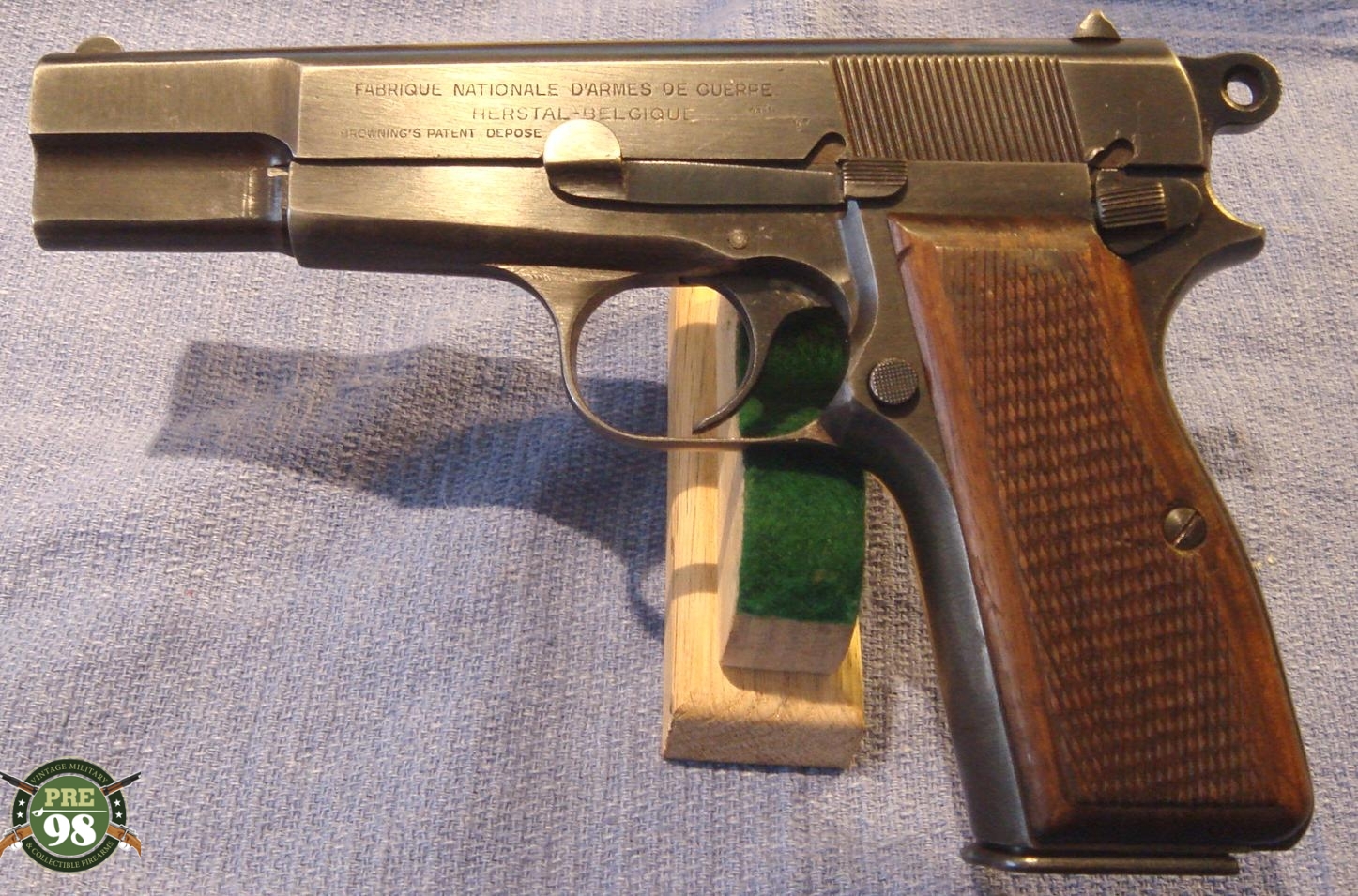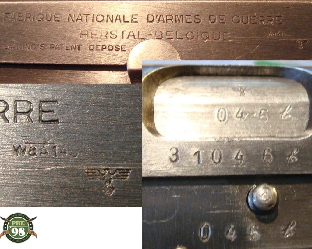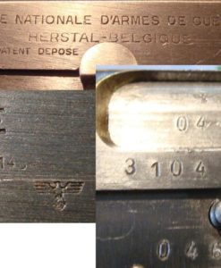 IN 96% ORIGINAL UNMESSED WITH CONDITION, WE HAVE A VERY NICE EXAMPLE OF A 1944 PROUDCTION FN HIGH POWER PROUDCUED UNDER NAZI OCCUPATION. THE PISTOL IS ALL MATCHING WITH A MINT BORE. IT IS WAFFENAMTED WAA140. WITH A CORRECT WARTIME MAG. THIS IS A VERY CLEAN CRISP EXAMPLE OF A VERY POPULAR WW2 PISTOL. THIS GUN COMES WITH A VERY NICE WAA140 PROOFED MAG AS WELL.
