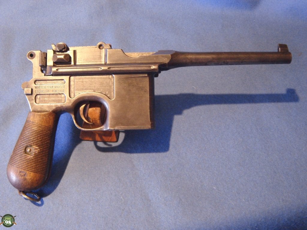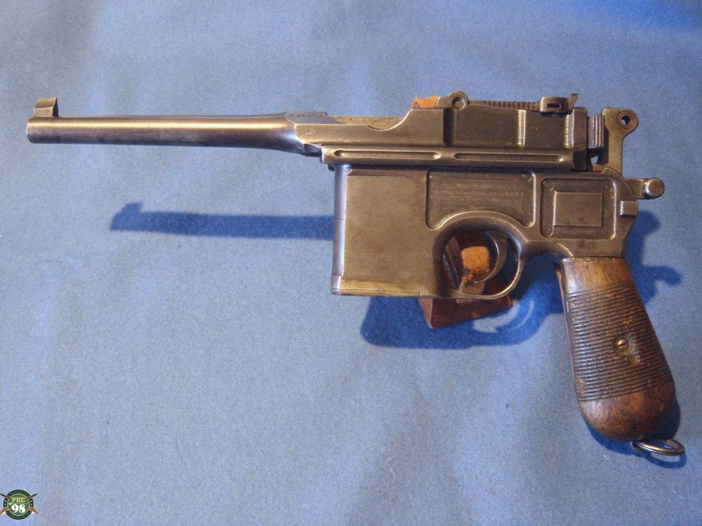 IN 92% ORIGNAL CONDITION, ALL MATCHING WITH AN EXCELLENT BORE, WE HAVE A NICE SOLID MAUSER C96 BROOMHANDLE IN 7.62 MAUSER. THIS IS THE FAMOUS C96 BROOMHANDLE AND THESE WERE WIDELY USED BY MACHINE GUN CREWS TO PROTECT THE GUNS AT CLOSE QUARTERS AND STORM TROOPS. IN THE DAYS BEFORE VIABLE SUBMACHINE GUNS THIS WAS THE CLOSE QUARTER WEAPON OF CHOICE. WE DO NOT GET TOO MANY BROOMHANDLES IN BECAUSE MOST OF WHAT IS OUT THERE IS JUNK, ALL THE GOOD ONES ARE IN COLLECTIONS. THESE ARE NOT COMMON GUNS AND THEY ARE ALOT RARER THAN MANY PEOPLE THINK BECAUSE THEY ARE USED TO SEEING SCORES OF TURDS THAT WERE BROUGHT IN FROM CHINA. IF YOU WOULD LIKE A NICE EXAMPLE OF A BROOMHANDLE THEN WE HAVE IT RIGHT HERE.