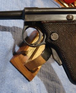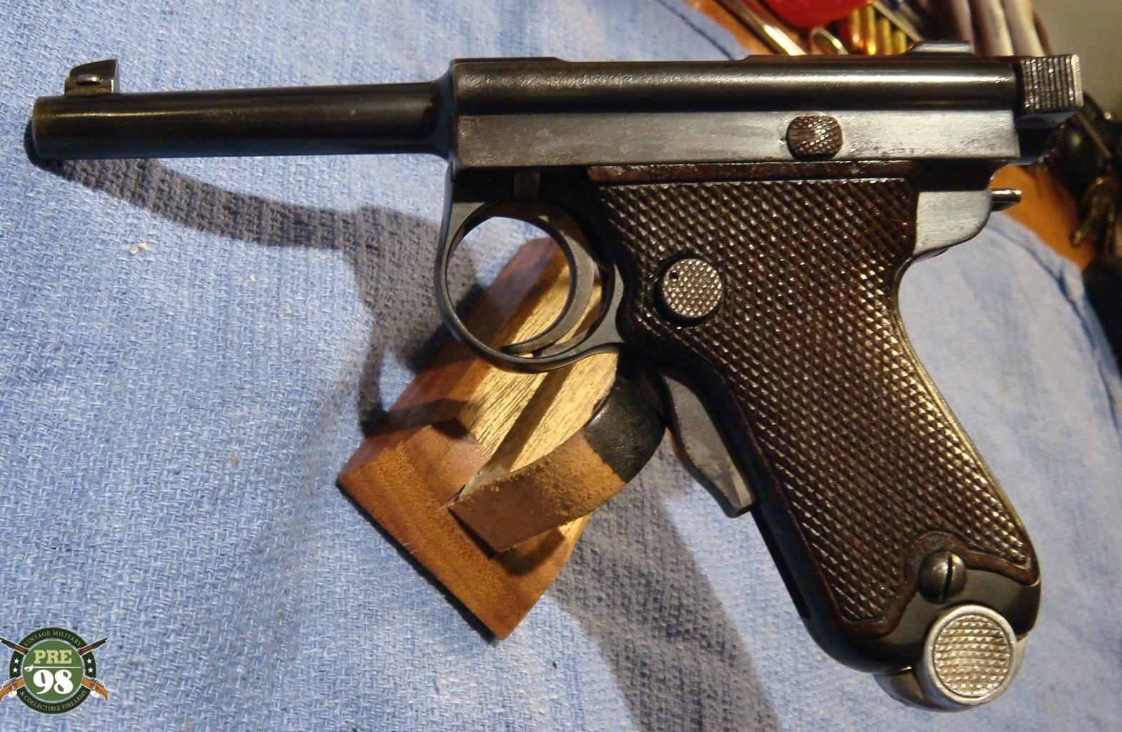 IN 92% EXCELLENT ORIGINAL CONDITION, WE HAVE AN EXTREMELY RARE MID PRODUCTION BABY NAMBU PISTOL ALL MATCHING TO INCLUDE BOTH OF THE ORIGINAL FACTORY NUMBERED MATCHING MAGS. AS YOU CAN IMAGINE, A BABY NAMBU WITH BOTH MAGS IS A FREAKISHLY RARE PISTOL. BORE IS EXCELLENT. TYPICAL HOLSTER FROSTING ON THE RAIL. BABY NAMBUS HAVING ALWAYS BEEN A PRESTIGE COLLECTORS ITEM AND THEY ARE HIGHLY SOUGHT AFTER AND TREASURED. THE MYSTIQUE OF THIS PISTOL IS AS LEGENDARY AS THE PARTY LEADER PPK OR THE KRIEGHOFF LUGER. WE ARE VERY PROUD TO ADD THIS ITEM TO OUR INVENTORY.