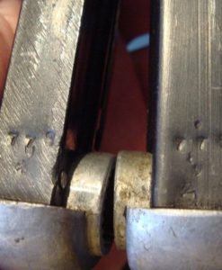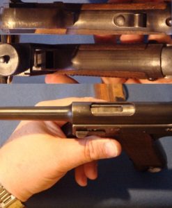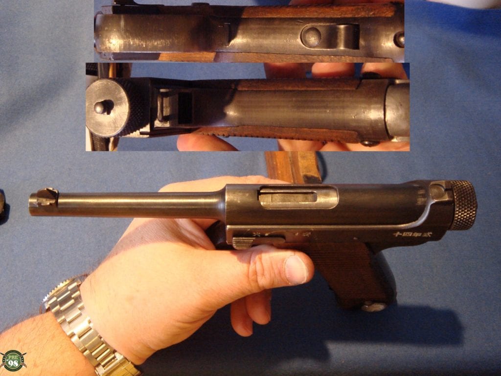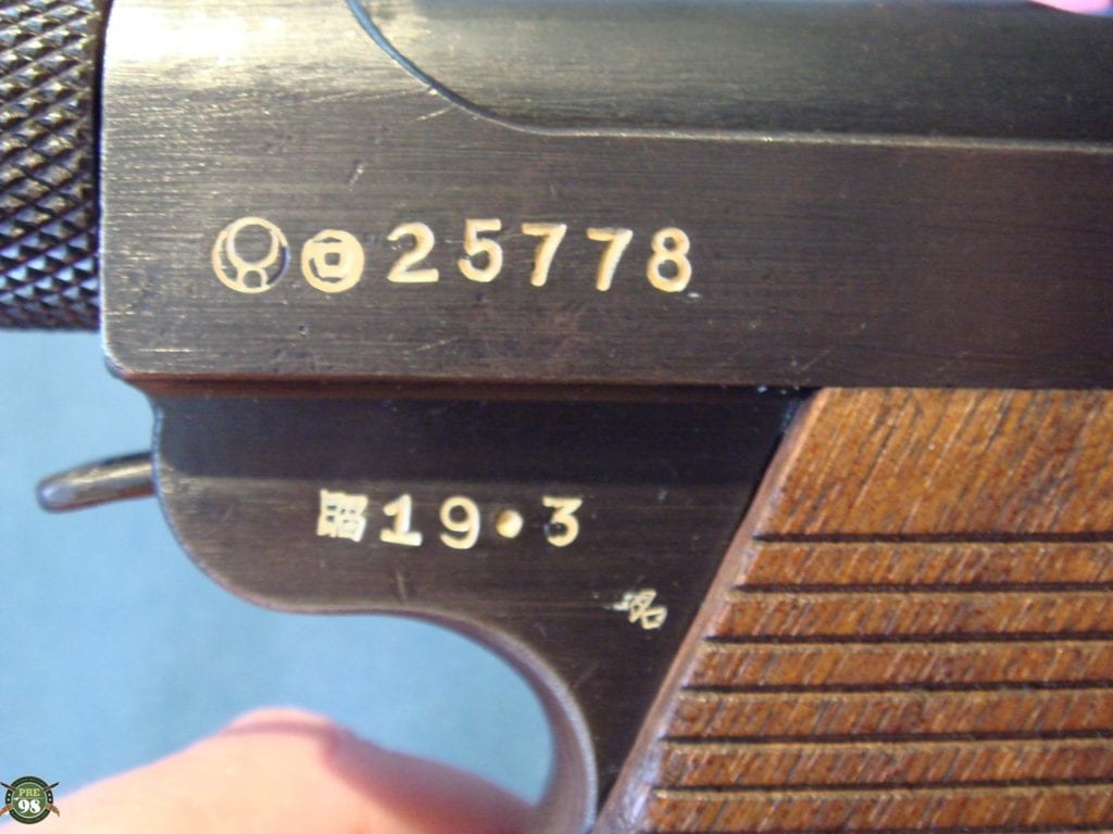 IN 98% MINT CRISP CONDITION, WE HAVE A MARCH 1944 PRODCUTION TYPE 14 NAMBU STILL WITH THE ORIGINAL MATCHING NUMBERED MAGAZINES THAT IT LEFT THE FACTORY WITH. THIS IS A NAGOYA MADE 2ND SERIES PISTOL AND ONE OF THE FIRST MADE WITH THE LARGE KNURLED COCKING PIECE. THE BEST THIS ABOUT THIS IS THAT IT STILL RETAINS THE ORIGNAL MAGS. YOU WILL NOTICE IN THE PIC THAT THE SPARE MAG HAS A PUNCH MARK. THE BORE IS IN EXCELLENT CONDTION, I BELIEVE THAT THIS PISTOL WAS VET BROUGHT BACK FROM JAPAN RIGHT AFTER THE WAR AND MAY HAVE BEEN PULLED OUT OF A DEPOT. NAMBUS WITH DOUBLE MATCHED MAGS ARE VERY RARE AND THIS IS A SUPER CRISP MID WAR EXAMPLE.