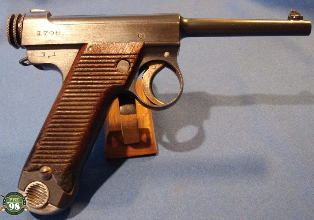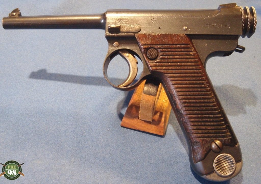 IN 95% CONDITION, ALL MATCHING EXCEPT THE MAG, AND WITH AN EXCELLENT BORE, WE HAVE A TYPE 14 NAMBU THAT WAS MANUFACTURED IN JANUARY, 1928. THIS IS A GREAT EXAMPLE OF A HARD TO FIND VERY EARLY PRODCTION PISTOL AND IS IN THE FIRST 2,000 PRODUCED. ONE OF THE THINGS THAT MAKES THIS SO INTERESTING IS THE VERY EARLY STYLE MARKINGS, ESPECIALLY THE EARLY NAGOYA FATORY MARKING WHICH IS QUITE SMALL. AS YOU MIGHT IMAGINE THESE PISTOLS ARE NOT EASY TO FIND LET ALONE IN THIS NICE CONDITION, ALOT OF THEM GOT LOST IN THE FIGHTING IN CHINA, THEN WITH WW2 VERY FEW SURVIVED LET ALONE THIS NICE. WHILE THERE ARE ALOT OF SMALL TRIGGER GUARD NAMBUS ABOUT YOU JUST DO NOT SEE THESE EARLY GUNS THAT OFTEN. THIS IS A GREAT OPPURTUNITY TO PICK ONE UP.