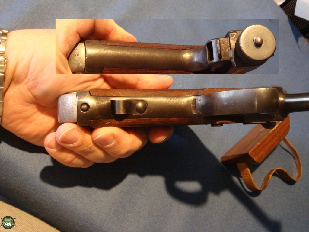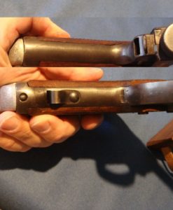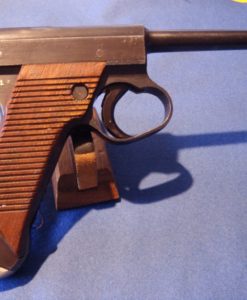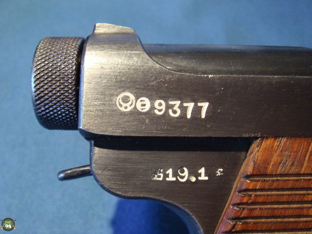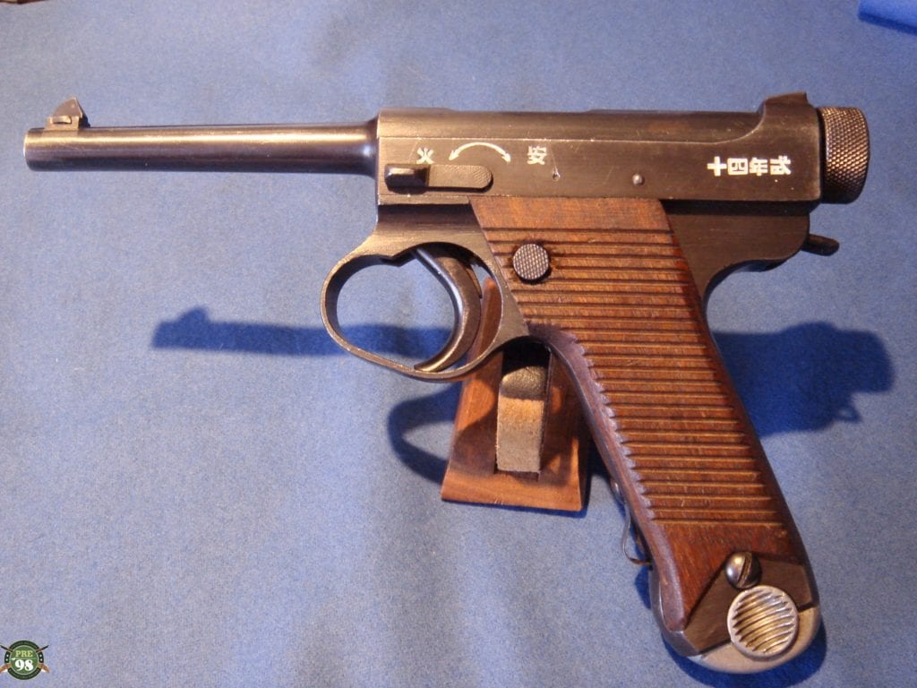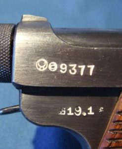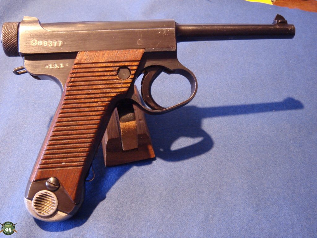 IN 97% CONDITION, ALL MATCHING INCLUDING THE MAGAZINE, WE HAVE A VERY DESIRABLE TYPE 14 NAMBU. THIS VARIANT HAS THE VERY RARE FINE KNURLED COCKING KNOB WHICH WAS USED ONLY FOR ABOUT A MONTH BEFORE THE CHANGE WAS MADE TO THE LARGE KNURLED KNOB. THESE NAMBUS ARE ONLY FOUND WITH THE 19.1 OR 19.2 DATE SO THEY ARE RELATIVELY RARE AND ARE VERY HARD TO FIND, DOUBLY SO WITH A MATCHING MAG AND IN THIS FINE FETTLE. iF YOU ARE A SEROUS COLLECTOR OF NAMBUS THIS IS AN IMPORTANT VARIANT TO OBTAIN.