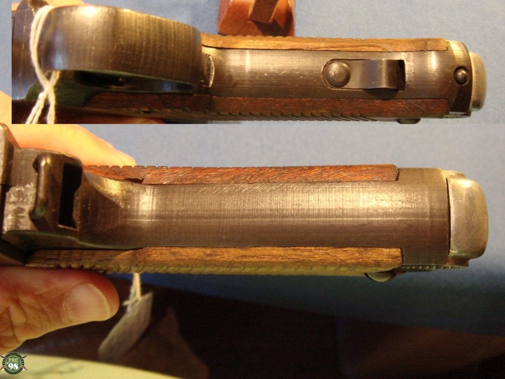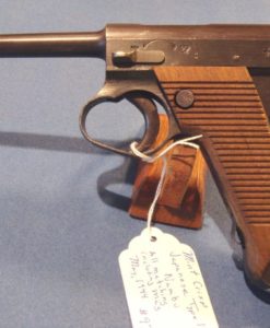 IN 99% CONDITION, ALL MATCHING INCLUDING THE MAGAZINE, WE HAVE A VERY DESIRABLE TYPE 14 NAMBU. THIS IS A MINT CRISP MAY 1944 EXAMPLE. THE PISTOL WAS ONE OF TWO THAT WERE LOOTED OUT OF A DEPOT IN A CAVE OR BUNKER ON TRUK IN 1945, SO IT BASCIALLY CAME RIGHT OUT OF A CRATE. THIS PISTOL WAS WELL CARED FOR AND STILL LOOKS LIKE NEW. IF YOU COLLECT NAMBUS THIS IS A SUPER CRISP EXAMPLE OF A LARE WAR PRODUCTION PISTOL.