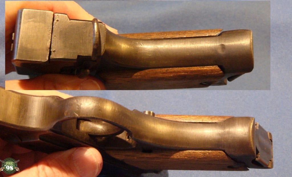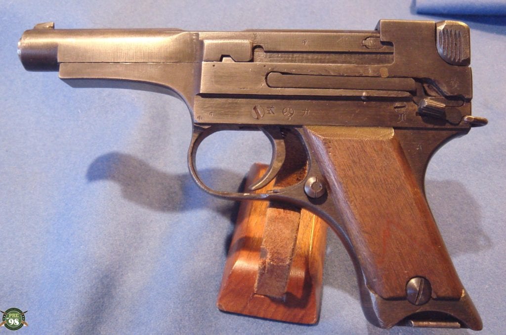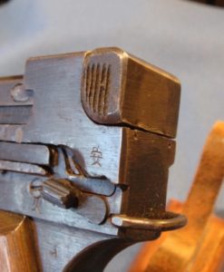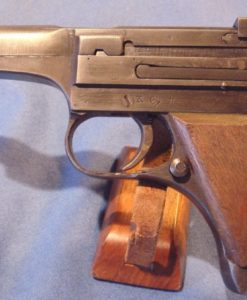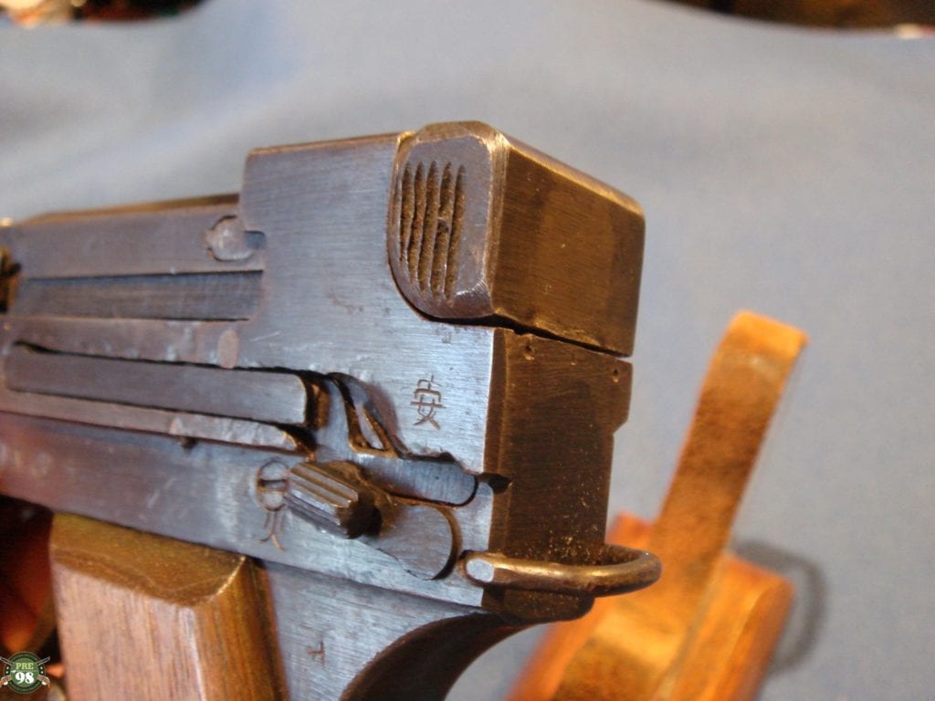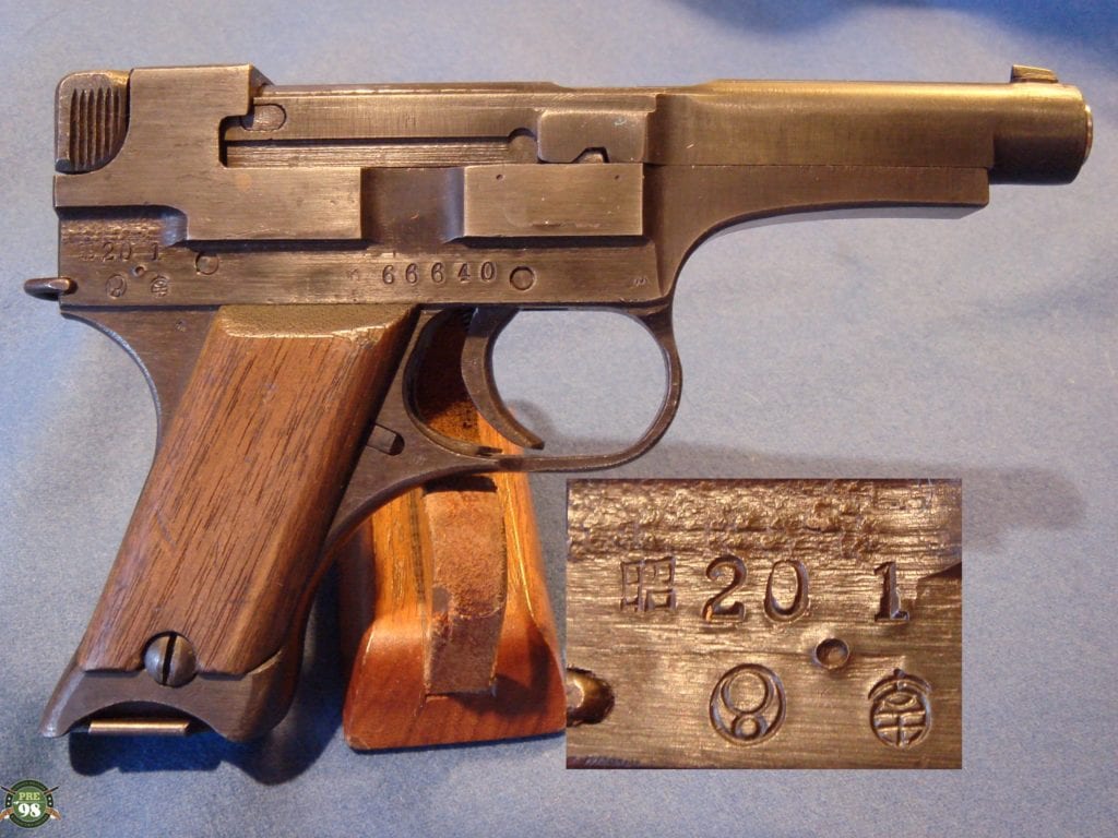 IN 97% ORIGINAL COARSE CONDITION, WITH A MATCHING MAG. WE HAVE A VERY DESIRABLE LATE WAR TYPE 94 NAMBU PISTOL. THIS IS THE LATE WAR SQUARE BACK VARIANT AND IT DOES HAVE A MATCHING MAG. PISTOL IS DATED 20.1 OR JANUARY OF 1945, SO IT IS GETTING DOWN TO THE WIRE, MADE AT TIME WHEN THE WORKER WAS LOOKING OVER HIS SHOULDER FOR THE B29’S. IF YOU LIKE JAPANESE PISTOLS THEN YOU KNOW ALL ABOUT THE ATTRACTION THAT SOME OF YOU HAVE TOWARDS THESE VERY INTERESTING LATE WAR EXAMPLES.