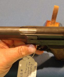 IN 99% VERY ROUGHLY MADE MINT CRISP CONDITION THIS GUN LOOKS LIKE A HIGH SCHOOL SHOP PROJECT. IN OTHER WORDS IT IS PRETTY DARN CRUDE. ALL MATHCING INCLUDING THE MAG AND WITH AN EXCELLENT BORE WE HAVE A AUGUST 1944 LATE PRODUCTION TYPE 94 NAMBU PISTOL. THIS IS ALSO WITH THE LATE SLABSIDE WOODEN GRIPS. ALTHOUGH THESE GUNS ARE DOGGED FROM ALL QUARTERS THEY DO WORK AND WILL KILL YOU DEADER THAN HELL. IT CERTAINLY IS BETTER THAN A SPEAR OR A ROCK ON THAT FINAL BANZI CHARGE. PLEASE KEEP IN MIND THAT THIS IS A MUCH SCARCER GUN THAN THE TYPE 14 AND ALOT OF PEOPLE ARE REALLY GETTING INTERESTED IN THESE PISTOLS.