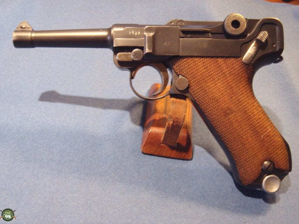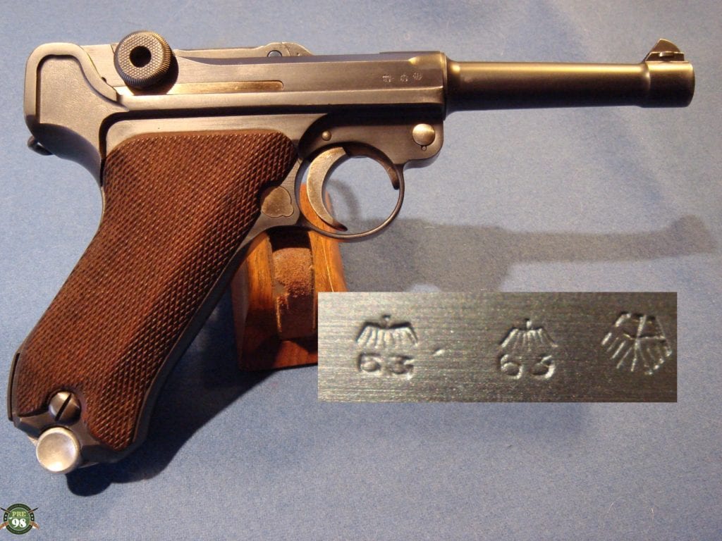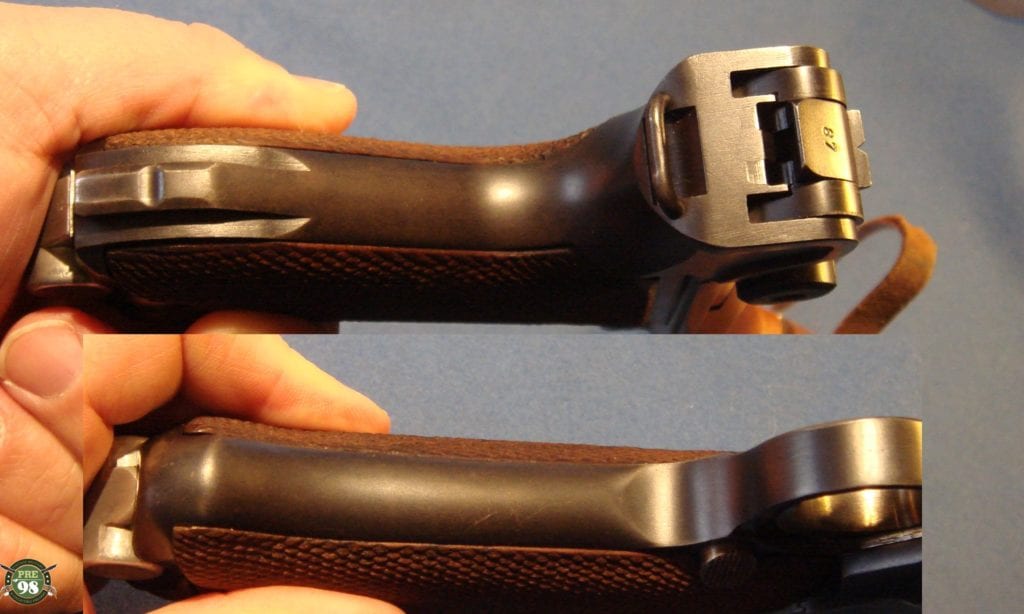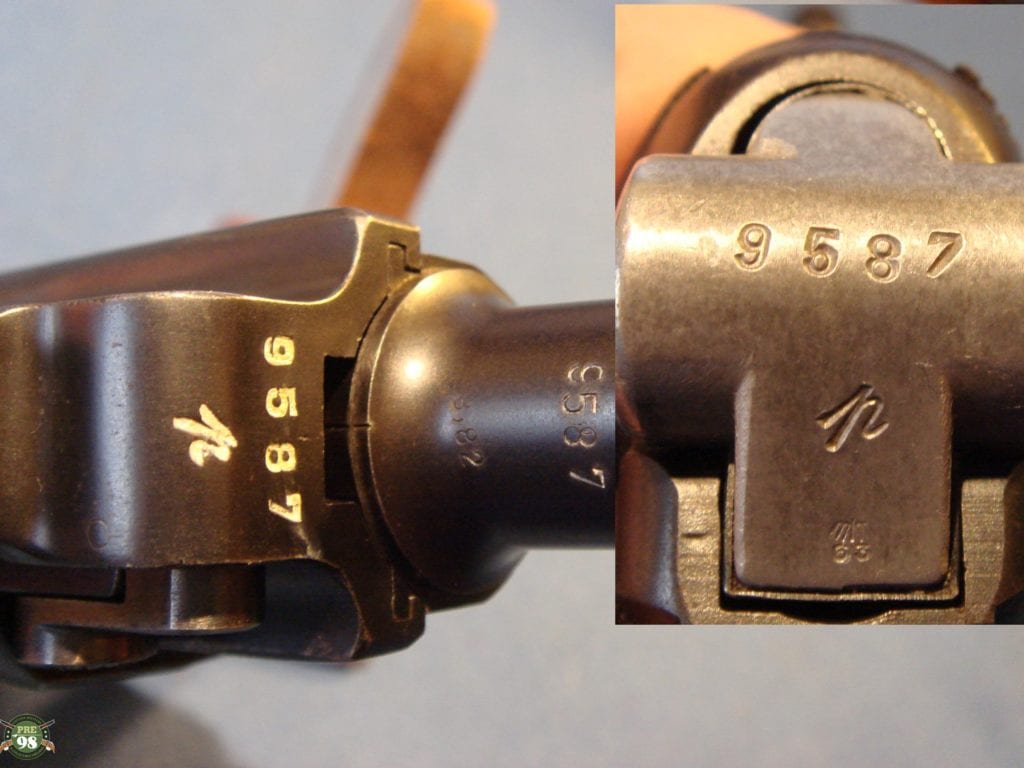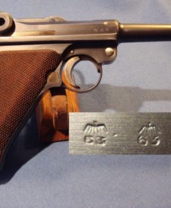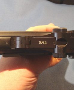 IN 98% ORIGINAL UNMESSED WITH CONDITION, ALL MATCHING INCLUDING THE MAGAZNE, WE HAVE A VERY PRETTY 1937 S/42 LUGER. THIS PISTOL IS IN THE P BLOCK WHICH WAS THE FIRST LETTER RUN IN 1937. THIS IS THE EARLY HARD TO FIND VARIANT WITH THE STRAWED PARTS. ONLY ABOUT ONE THIRD OF THE LUGERS PRODUCED IN 1937 WERE STRAWED AND RUST BLUED BEFORE THEY SWITCHED OVER TO THE HOT SALT BLUE FINISH. THESE WERE THE LAST OF THE REALLY PRETTY GUNS AND THEY ARE HIGHLY SOUGHT AFTER BY COLLECTORS. NEXT TO BLACK WIDOWS WE GET THE MOST REQEUSTS FOR STRAWED 37 GUNS.