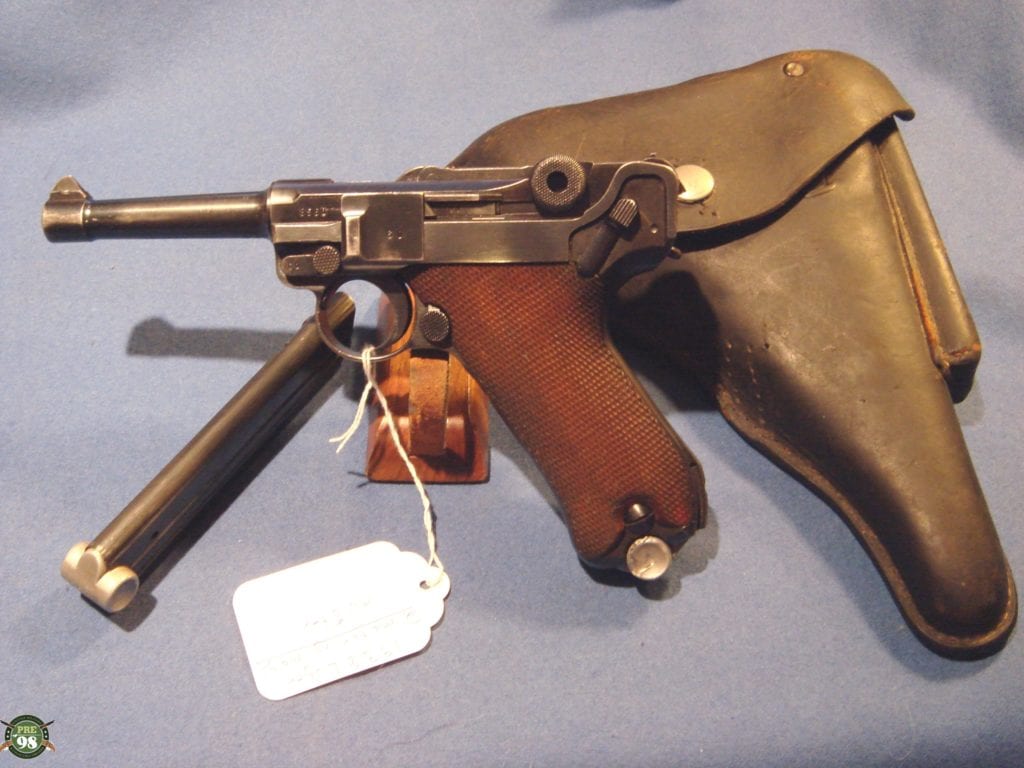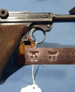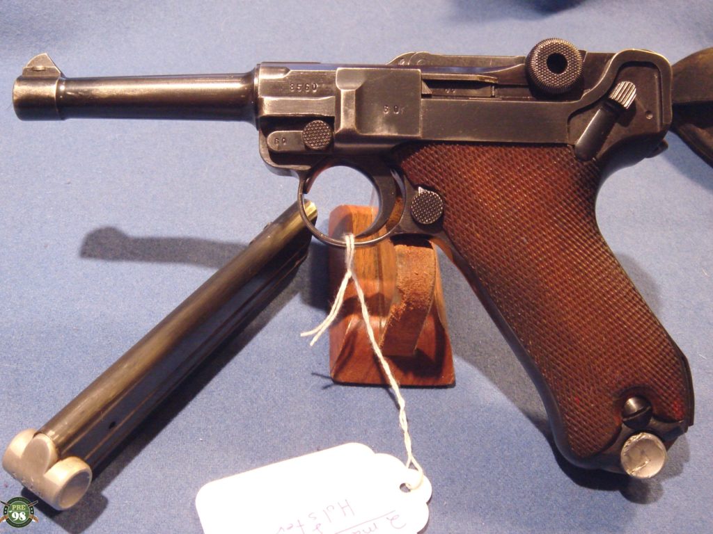 IN 94% ORIGINAL CONDITION, ALL MATCHING INCLUDING BOTH THE ORIGINAL MAGS, WE HAVE A DECENT EXMAPLE OF A 1938 S/43 CODED LUGER. THE BORE IS MINT AND THE GRIPS AND FIRING PIN ARE MATCHING. THIS IS A VET BROUGHT BACK PISTOL RIGHT OUT OF THE WOODWORK, STILL WITH THE VET REPAIRED HOLSTER THAT HAS STAYED WITH THIS OLD WAR HORSE SINCE IT WAS BROUGHT BACK. THE BEST PART OF THIS WHOLE DEAL IS THAT THIS IS A NICE DOUBLE MAG MATCHED GUN THAT YOUR WILL NOT HAVE TO SHELL OUT 5K FOR. THE CONDTION IS A TAD UNDER 95% BUT THIS IS AT A STEAL PRICE FOR WHAT YOU ARE GETTING.
