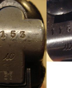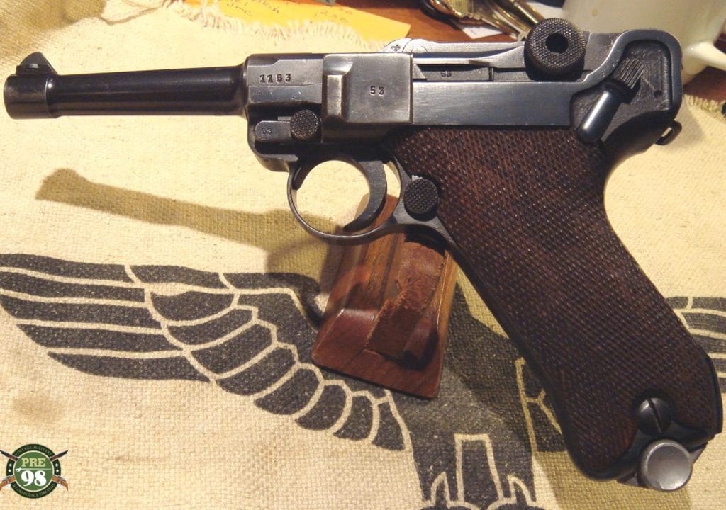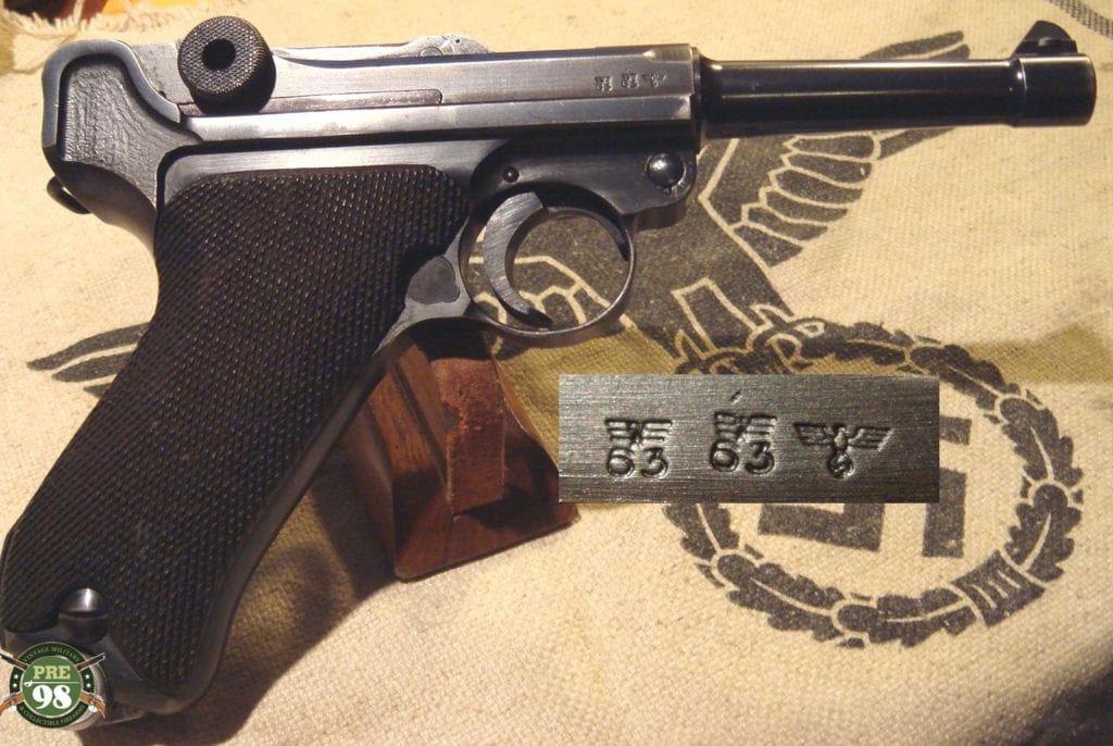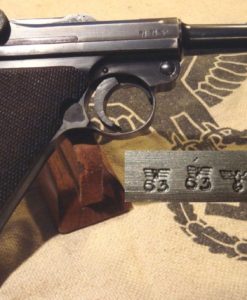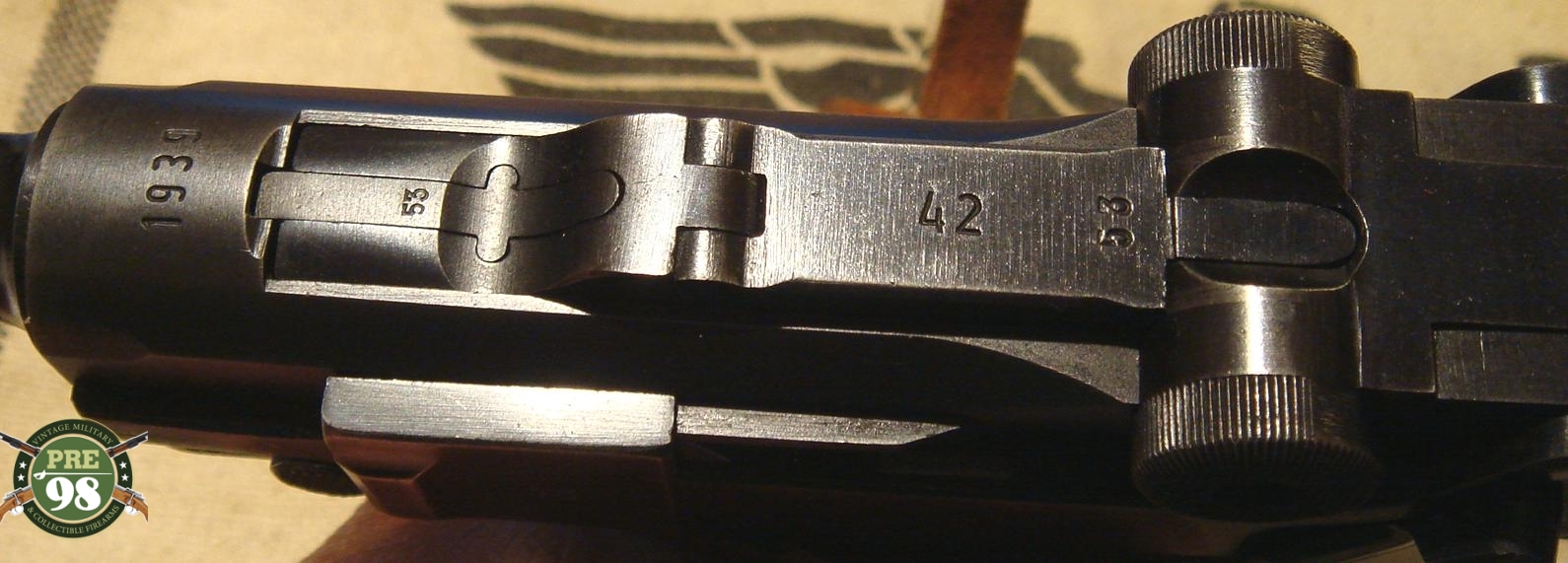 IN 96% ORIGINAL CONDITION, ALL MATCHING INCLUDING THE ORIGINAL MAG, WE HAVE A REALLY NICE EXMAMPLE OF A 1939 42 CODE LUGER. THIS IS ONE OF THE HARDER LUGERS TO FIND AS ABOUT 1/3 OF 1939 PRODUCTION WAS S/42 CODED. THIS GUN WAS MADE AROUND THE TIME THAT THE SECOND WORLD WAR BEGAN WITH THE INVASION OF POLAND. THIS PISTOL IS ALSO DESIRABLE IN THAT IS HAS THE DOUBLE LARGE EAGLE 63 PROOFS. THIS IS A CLASSIC EXAMPLE OF A GERMAN WW2 LUGER, AND CERTAINLY IN THAT VERY KEEPABLE CONDITION.